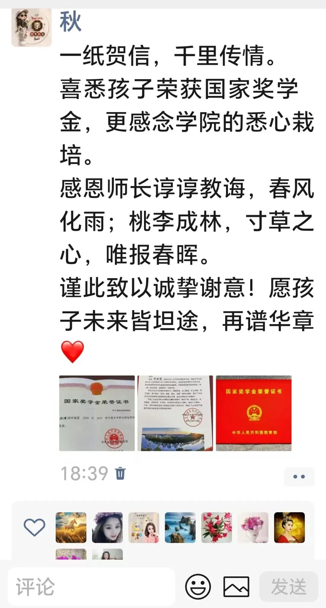 为深化家校协同育人、树立榜样引领、激励学生成长,黑龙江农业经济职业学院向 2024-2025学年国家奖学金获奖学生家庭寄送喜报贺信,并陆续收到家长真情回信,充分彰显了家校同心、共育英才的良好氛围。