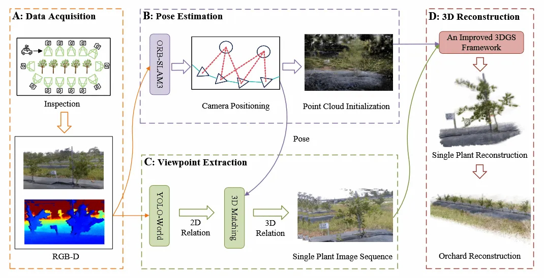 果园环境的高效大规模3D重建对于机器人检测和精准农业至关重要,但现有方法难以应对非结构化场景、可变光照和计算资源瓶颈。为此,该研究提出一个为果园检查机器人量身定制的粗到细高斯重构框架:提出了针对于果园环境的RGBD图像采集策略;基于增加了稠密模块的ORB-SLAM3来实现稳健的大规模姿态估计和点云生成;随后通过基于YOLO-World的检测和3D匹配算法提取单个植物视图;最后采用分而治之的策略,使用改进的3DGS对每个植物进行重建。