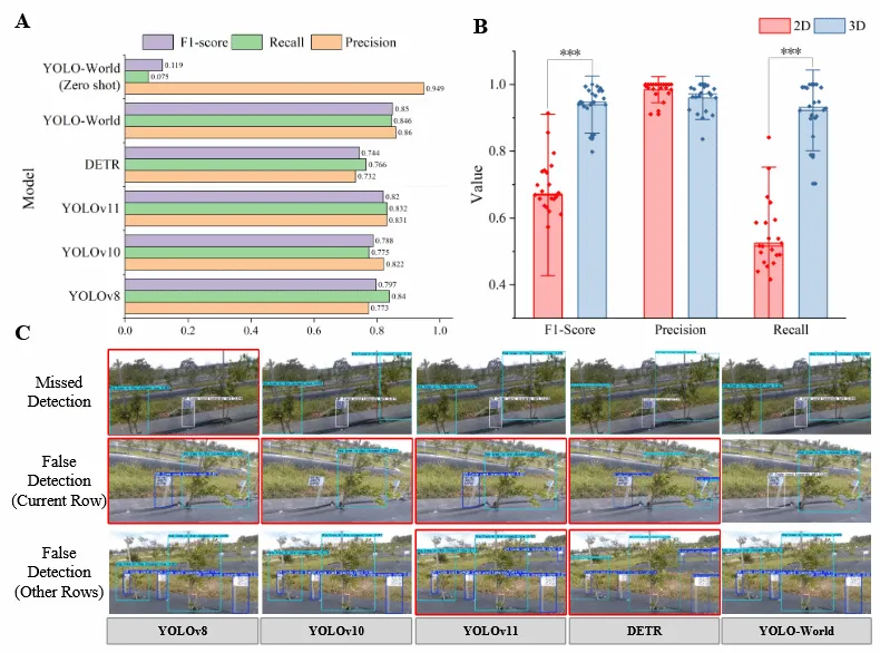 该研究的核心贡献主要体现在三个方面。在数据采集策略上,研究团队创新设计了适配果园巡检机器人的专属采集方案,采用沿垄间周边拍摄的方式,替代传统的植物环绕拍摄模式,有效解决了高种植密度场景下机器人多视图捕获的效率难题,为后续技术落地奠定了数据基础。在位姿估计算法层面,研究通过基于RGB-D的SLAM技术(即时定位与地图构建),结合定制化密集映射模块,成功实现了大规模点云的精准生成。该技术可有效缓解果园场景中光照变化、植物间尺度差异较大等问题带来的干扰,大幅提升了位姿估计的准确性与稳定性。在大尺度果园重建方面,研究团队创新性地将3DGS(3D高斯splatting)技术与深度正则化、区域感知优化相结合,采用“分而治之”的思路,实现了大尺度果园中单个植物的精准重建。