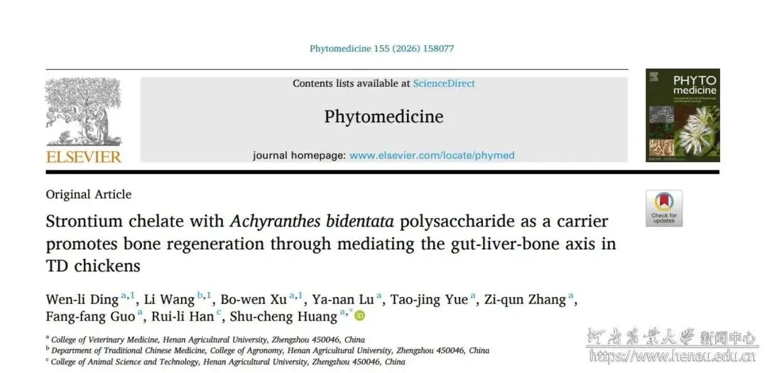 近日,河南农业大学黄淑成副教授课题组在《Phytomedicine》期刊发表题为“Strontium chelate with Achyranthes bidentata polysaccharide as a carrier promotes bone regeneration through mediating the gut-liver-bone axis in TD chickens”的研究论文。河南农业大学为该论文第一完成单位,动物医学院黄淑成副教授为通讯作者,硕士研究生丁文丽、农学院王丽副教授及硕士研究生徐博文为共同第一作者。