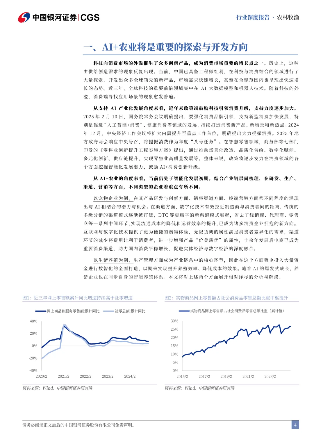 目前 AI + 农业仍处于发展初期,不同细分领域的落地重点有所差异:宠物行业的 AI 应用集中在研发、渠道、营销端;生猪养殖行业则聚焦于生产管理环节的数智化升级,以此实现降本增效。