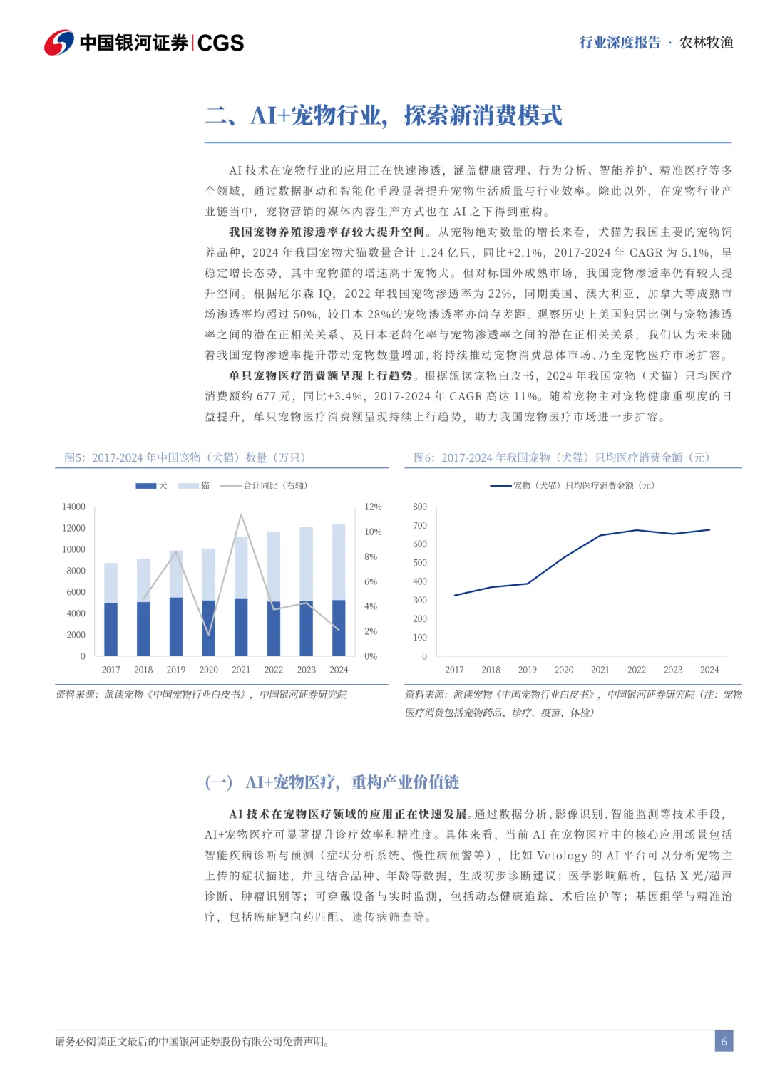 同时,单只宠物的医疗消费持续上行,2024 年犬猫只均医疗消费额约 677 元,2017-2024 年复合增速高达 11%,带动宠物医疗市场快速扩容。