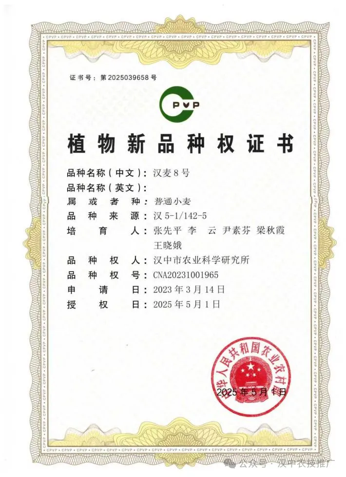 “汉麦8号”审定编号:陕审麦20220020,半春性品种,宜陕西南部麦区及相似生态区种植,生育期205.6天,亩穗数27.85万、穗粒数39.3粒、千粒重43.5克。田间表现综合抗病性较好、茎秆粗壮抗倒;突出特点:大穗大粒、籽粒品质好、耐病性强、丰产性强。