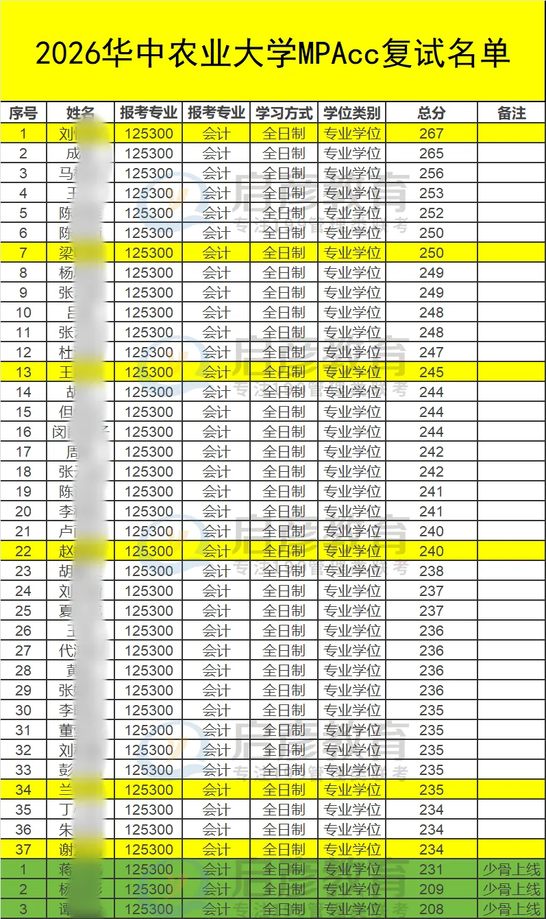 华中农业大学MPAcc复试名单如下