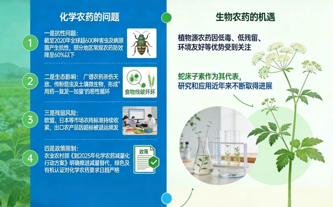 在此背景下,植物源农药以低毒、低残留、环境友好等特性日益受到关注,蛇床子素作为代表之一,近年来研究和应用不断取得进展。