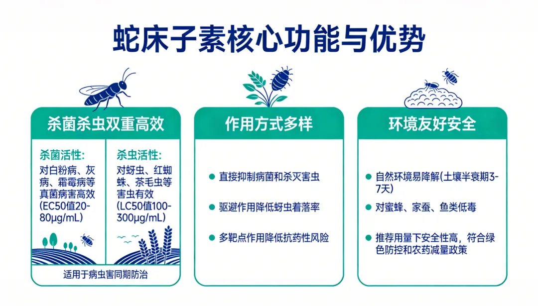 蛇床子素的作用机理独特,对于病原真菌,可抑制菌丝生长与孢子萌发,干扰细胞壁合成;对于害虫则作用于神经系统,兼具触杀与胃毒作用,并表现出拒食及产卵忌避效应。