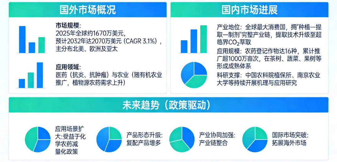 国外市场中,全球蛇床子素市场规模稳步增长,主要分布在北美、欧洲和亚太地区,应用涵盖制药、食品及农业,其中植物源农药在有机农业推动下需求上升。中国作为全球最大消费国,已形成从原料种植到制剂生产的完整产业链,提取技术和剂型持续升级;在农业领域登记作物达16种,推广应用超1000万亩次,在茶树、蔬菜等作物上形成成熟应用体系,科研机构持续提供技术与机理支撑。