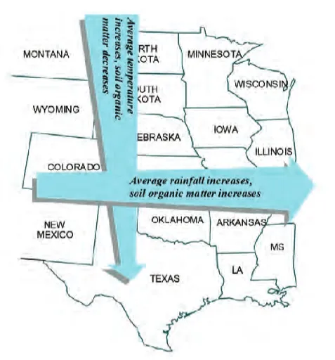 有机物的形成与稳定性在很大程度上取决于长期的湿度与温度变化趋势。当平均气温升高时,土壤中的有机物含量会减少;而当湿度增加时,土壤有机物含量则会上升。较高的温度会加速有机物的分解过程,使其转化为可溶于水的物质,这些物质随后会从土壤中流失。湿度的增加有利于植物生长,从而产生更多的有机残留物。中西部和大平原地区土壤中湿度、温度及有机物含量的变化趋势如图1所示。