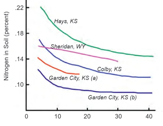 经过数千年的发展,中西部地区的土壤中积累了大量的有机物质。然而,由于对原始土壤的持续耕作,土壤中的有机物质含量有所下降。这样一来,有机物质的氧化程度增加,而通过农作物吸收导致的土壤中有机氮的含量也减少了(见图2)。原本含有4%到5%有机物质的土壤,在经过50年的耕作后,其有机物质含量可能只有1%到2%。不过,由于广泛使用了商业肥料,中西部地区经过耕作的土壤已经达到了新的有机物质平衡状态。如果采用少耕技术、轮种豆科植物并合理使用肥料,那么随着时间的推移,土壤中的有机物质含量有望再次上升。图2,长期耕作对美国中西部地区土壤中有机氮含量的影响(引自W.J. Hase等人,1957年的研究;《耕作方式与土壤处理对大平原地区土壤中氮和碳含量的影响》,美国农业部技术报告第1167号,华盛顿特区)。氮循环