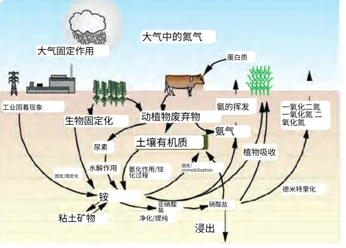 在土壤中,铵态氮和硝态氮是最主要的无机氮形态。铵态氮既有可交换的形式,也有不可交换的形式。而亚硝酸盐和一氧化二氮在土壤中的含量则相对较少。植物通常只能利用铵态氮和硝态氮。实际上,亚硝酸盐对植物是有毒的。氮循环过程(见图3)展示了各种无机氮化合物在土壤中的转化过程。氮循环始于最稳定的氮形态——氮气,随后经历固定、矿化、硝化、淋溶、植物吸收、氨气挥发、反硝化等过程,最终再次以某种形式被固定下来。图3 氮循环示意图氮的固定