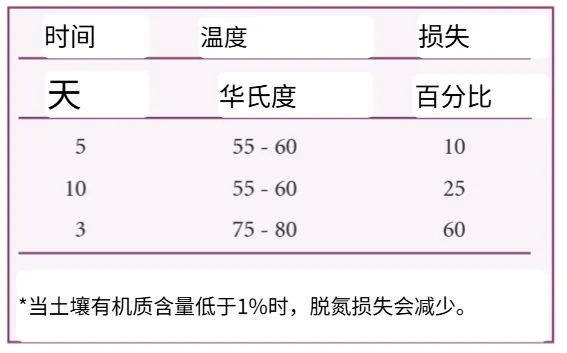 反硝化作用是指硝酸盐被转化为各种气态氮化合物的过程,这些气态氮化合物随后可以释放到大气中(如一氧化氮、一氧化二氮、氮气等)。这一过程发生在氧气供应不足的条件下,此时厌氧细菌会在有有机物等碳源存在的情况下,利用硝酸盐进行呼吸作用。在灌溉季节,那些长时间被水淹没的田地低洼处,常常会出现因反硝化作用而导致氮元素流失的情况,从而引发氮素不足的问题。饱和土壤中的反硝化作用所导致的氮损失量会随着温度以及土壤中可利用的碳元素(即有机物质)含量的不同而有所变化。表1展示了时间和温度对反硝化作用导致的氮损失量的影响。氨的挥发