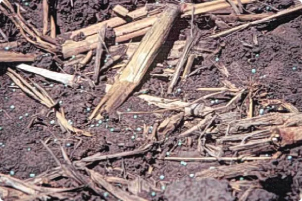 氨气(NH3)向大气的释放过程被称为氨挥发。严格来说,氨挥发与施用的无水氨的气体损失不同,因为无水氨不会留在土壤中。而氨挥发是指土壤中的铵离子由于pH值的影响而转化为氨气,进而以气体形式逸散到空气中。通常情况下,只有在使用含有尿素的肥料时,才会出现氨挥发的问题,比如尿素或尿素硝酸铵混合肥。土壤中的尿素会在脲酶的作用下被分解成铵离子。方程6氨的挥发。当农民在土壤表面直接施用含有尿素的肥料时,氨的损失可能会非常严重。尤其是在土壤中有大量残渣存在,且天气又潮湿温暖的情况下(见图5)。由于氨的挥发而导致的尿素中所含氮元素的损失幅度很大,可能从没有损失到所施氮量的50%或更多不等。例如,在春季将尿素施用于粘壤土中,如果施用后至少一周内没有降雨,那么大约有10%到20%的氮元素会因氨挥发而损失掉。影响氨挥发程度的因素包括土壤湿度、温度、土壤pH值、土壤的缓冲能力、脲酶活性、土壤表面的残渣覆盖情况、降水量、风速等。当土壤潮湿温暖,且表面有大量残渣时,尿素就很容易挥发掉。此时,只要能有5英寸(约12.7厘米)或更多的降水或灌溉,就能让尿素充分渗入土壤中,从而减少氨的挥发损失。图5:玉米残秸杆上的尿素颗粒。图6 氮肥施用与灌溉对非饱和带硝酸盐含量的影响(上大蓝自然资源区——内布拉斯加中部水质监测项目),紫色为草地/牧场,蓝色为玉米地氮淋溶