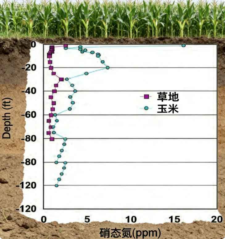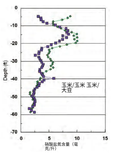 在条件允许的情况下,种植者应尽量让玉米和高粱等作物与大豆、苜蓿和三叶草等需氮量较高的作物轮作。轮作不仅可以减少对化肥氮的需求,还能有效降低病虫害的发生率以及病害带来的危害。大豆种植后种植玉米时,土壤中的氮含量会增加,这不仅是因为大豆残渣中含有大量的氮元素,还因为大豆残渣的碳氮比较低,从而使得土壤中的氮元素更易于释放出来,供下一季作物使用。在种植玉米之前,如果先种植苜蓿或三叶草等豆科植物,那么随着这些植物残渣的腐烂分解,土壤中的可用氮含量也会增加。豆科植物能够有效吸收土壤中的硝酸盐,从而显著降低玉米种植后土壤中的硝酸盐含量。图13展示了每年轮作玉米和大豆对非饱和带中硝酸盐含量的影响。该数据来自1992年内布拉斯加大学南中心研究与推广中心农场进行的长期耕作试验所取得的土壤样本,显示了1984年开始实行玉米-大豆轮作后的效果。图13 每年轮作玉米/大豆对非饱和带中硝酸盐含量的影响(A. Katupitiya,1995年;长期耕作方式对根区及中间非饱和带中硝酸盐的积累、迁移及反硝化过程的影响;内布拉斯加大学博士论文)。监测作物是否缺氮