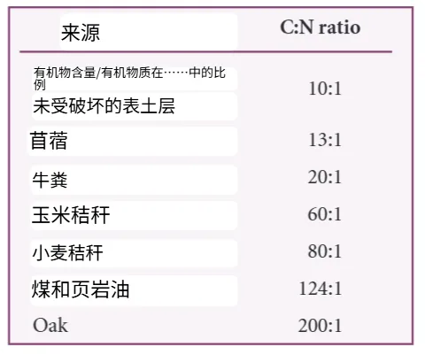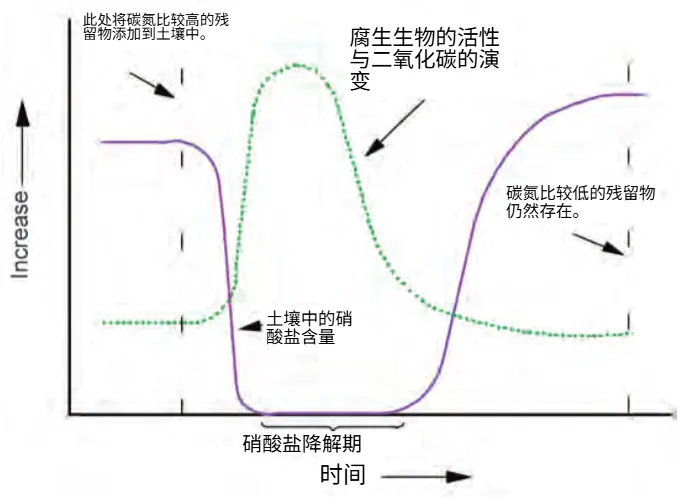无机氮被土壤中的微生物分解植物残体时被暂时固定下来,这一过程其实是一种循环利用机制。被固定的氮在一段时间内无法被植物利用,但随着植物残体的不断分解以及微生物数量的减少,这些氮最终又会重新变得可供植物利用(见图7)。为了减少肥料中氮的固定现象,可以将肥料置于作物残体之下,而不是将其与残体一起混入土壤中。生产者可以通过将无水氨或相关溶液直接注入土壤来实现这一目的。图7植物可利用的氮含量取决于微生物的分解作用。在植物处于静止状态时,硝酸盐还原作用所持续的时间,取决于诸如湿度、温度等环境因素,以及残体中的碳氮比。土壤中的有机物质通常含有约50%的碳和5%的氮。这一比例(10:1)对各种有机物质来说都是相对恒定的。而植物残体的碳氮比则有所不同:对于年轻的豆科植物组织来说,其碳氮比为10:1;而对于某些谷物的秸秆而言,这一比例可高达200:1。氮含量较低的植物组织通常更难被分解,因此需要更长的时间才能让其中的氮元素重新被植物利用。图8,固定化尿素的早期示例(尿素与作物残体混合处出现褪绿区域),旁边是注氨田(呈深绿色区域)当含碳氮比较高的植物残体被掺入土壤中后,微生物就开始对它们进行分解。此时,微生物的数量会迅速增加,这一过程伴随着二氧化碳的释放。微生物从土壤中吸收氮元素以用于自身的生长代谢。因此,在一段时间内,土壤中的无机氮含量会下降,从而可能无法满足植物的生长需求。随着植物残体的不断分解,其碳氮比会逐渐降低。当碳氮比降至约17:1时,氮元素就变得可以被植物利用了。分解过程会持续进行,直到碳氮比达到约10:1到15:1为止。植物同化作用