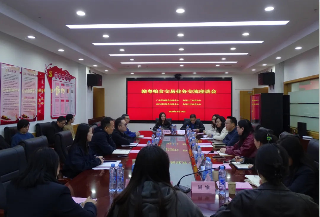 3月19-20日,广东华南粮食交易中心有限公司党总支书记、副总经理袁宝友,中国农业发展银行广东省分行粮棉油与产业客户处副处长刘相坤一行来赣调研交流。南昌国家粮食交易中心(江西省粮油购销和储备监测中心)主任宋鹏、中国农业发展银行江西省分行粮棉油处副处长黄先华及中心相关负责同志参加座谈。
