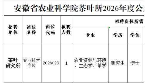 安徽省农业科学院茶叶研究所是安徽省政府直属的公益一类事业单位,主要从事茶树种质资源与新品种选育、茶树生理与有害生物综合治理、茶园土壤肥料、茶叶加工品质调控与资源利用研究方向的科学研究。现因工作需要,拟招聘博士毕业生1名,现将有关招聘事项预公告如下: