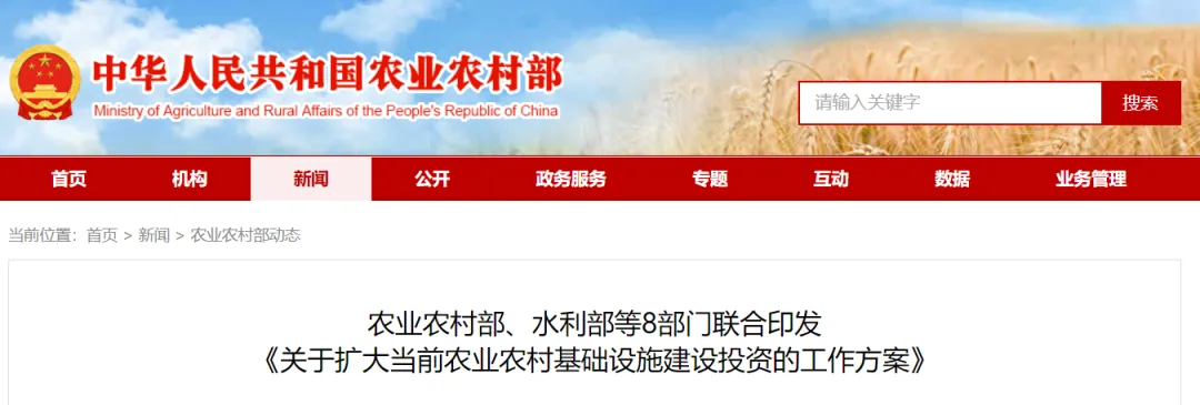 为扩大农业农村有效投资、提升农业综合生产能力,日前,农业农村部、水利部、发展改革委、财政部、自然资源部、商务部、人民银行、银保监会等8部门联合印发《关于扩大当前农业农村基础设施建设投资的工作方案》(以下简称《方案》),就加强农业农村基础设施建设作出部署安排。