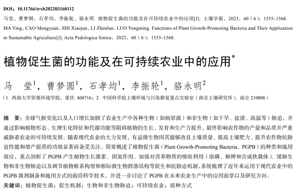 本文系统综述了PGPB的种类、促生机制、菌剂制备、施用方式及其在现代农业中的应用,强调了PGPB在应对生物与非生物胁迫、减少化肥农药使用、提升土壤健康与作物产量方面的巨大潜力。文章为后续研究提供了理论基础,也为绿色农业技术的推广提供了实践指导。