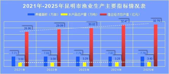 全市渔业生产通过稳固传统池坝塘、水库养殖基础,确保青、草、鲢、鳙、鲤、鲫等大宗淡水鱼生产能力,同步大力推进集约化、高密度、精细化设施渔业,强化特色高品质水产品生产。昆明市自2021年至2025年,已实现水产品产量“四连增”。