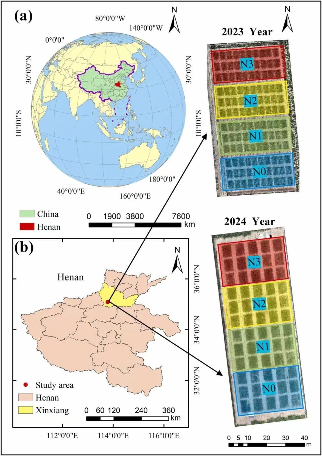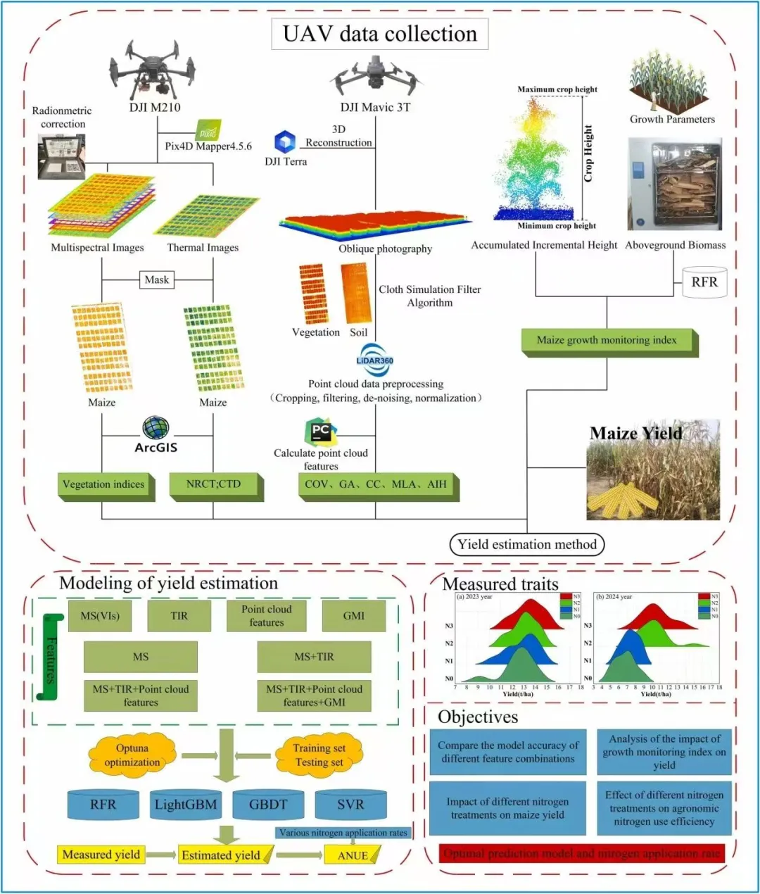 本研究基于多光谱、热红外及倾斜摄影测量无人机(UAV)遥感影像,构建了玉米多源遥感特征体系,并将其与作物生长监测指数(Growth Monitoring Index, GMI)进行耦合,系统评估了不同机器学习模型在产量估测中的表现。同时,进一步分析了不同施氮水平对玉米农学氮肥利用效率(Agronomic Nitrogen Use Efficiency, ANUE)的影响。