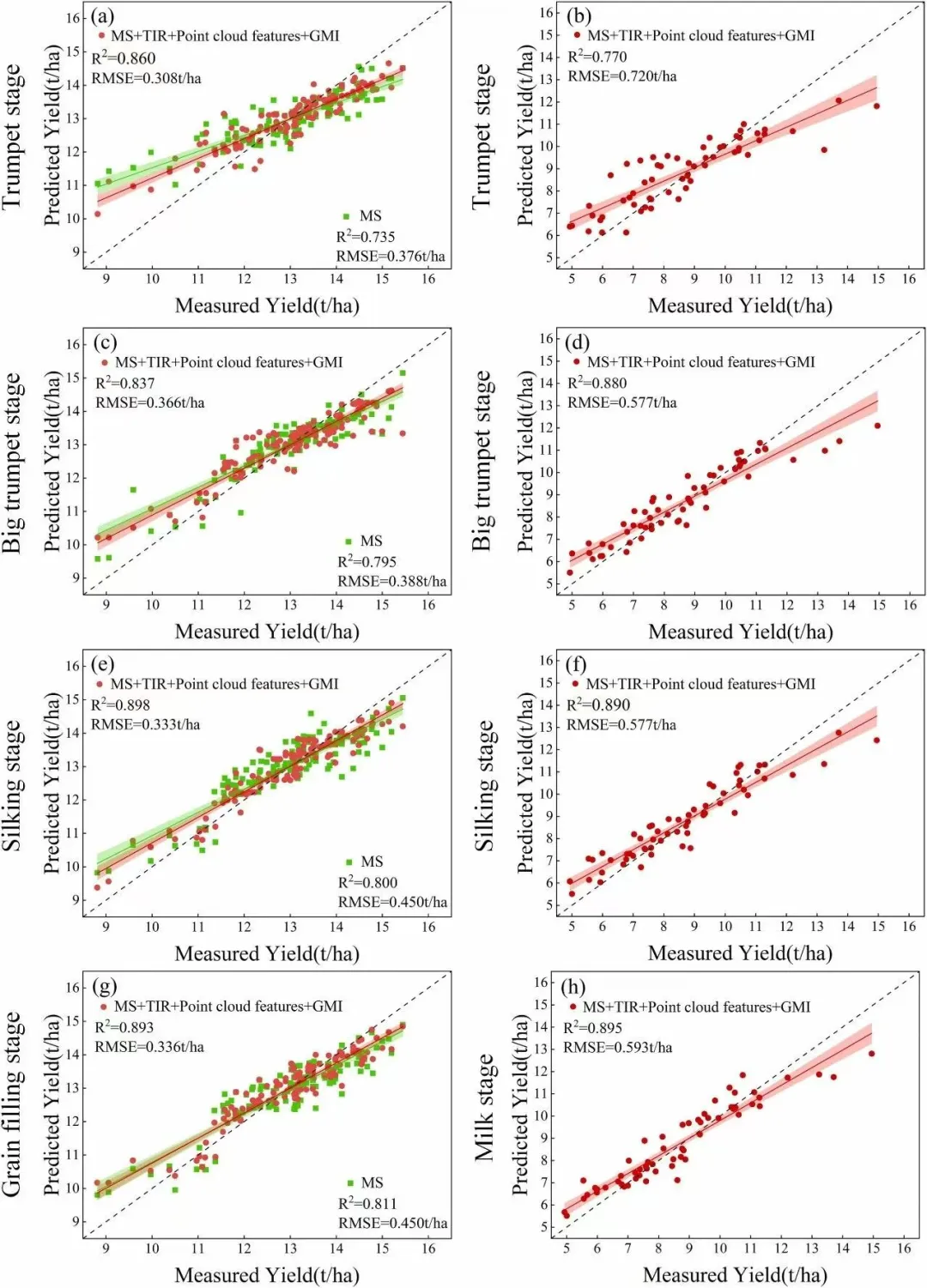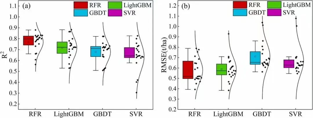 结果表明,融合多源遥感特征与 GMI 的模型在产量估测中表现良好,其决定系数(R2)介于 0.531–0.882 之间,均方根误差(RMSE)为 0.384–1.078 t·ha-1。不同机器学习算法表现存在差异,其中随机森林回归(Random Forest Regression, RFR)精度最高(R2 = 0.563–0.880,RMSE = 0.393–0.789 t·ha-1);LightGBM 模型整体优于梯度提升决策树(GBDT),而支持向量回归(SVR)表现相对较弱。