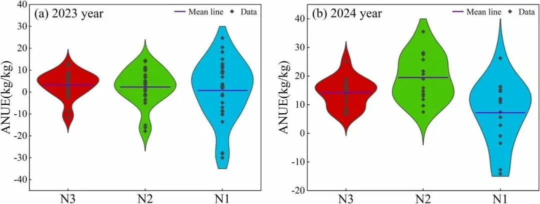 此外,产量估测精度在不同生育阶段存在差异,其中以抽丝期(silking stage)模型表现最佳。不同施氮处理对玉米产量具有显著影响,但过量施氮并未显著提升产量或氮肥利用效率(ANUE)。