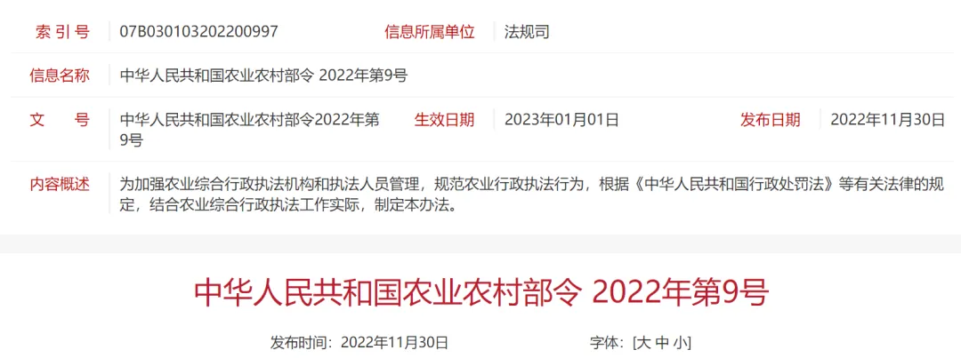 《农业综合行政执法管理办法》农业农村部令 2022年第9号