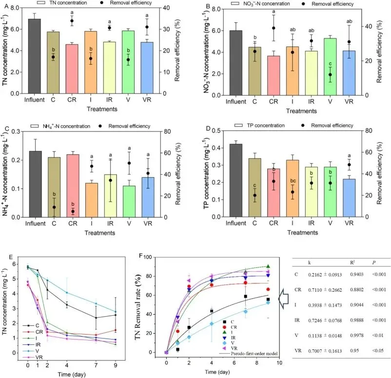 图1:六种生态沟渠在动态和静态期氮磷去除性能。