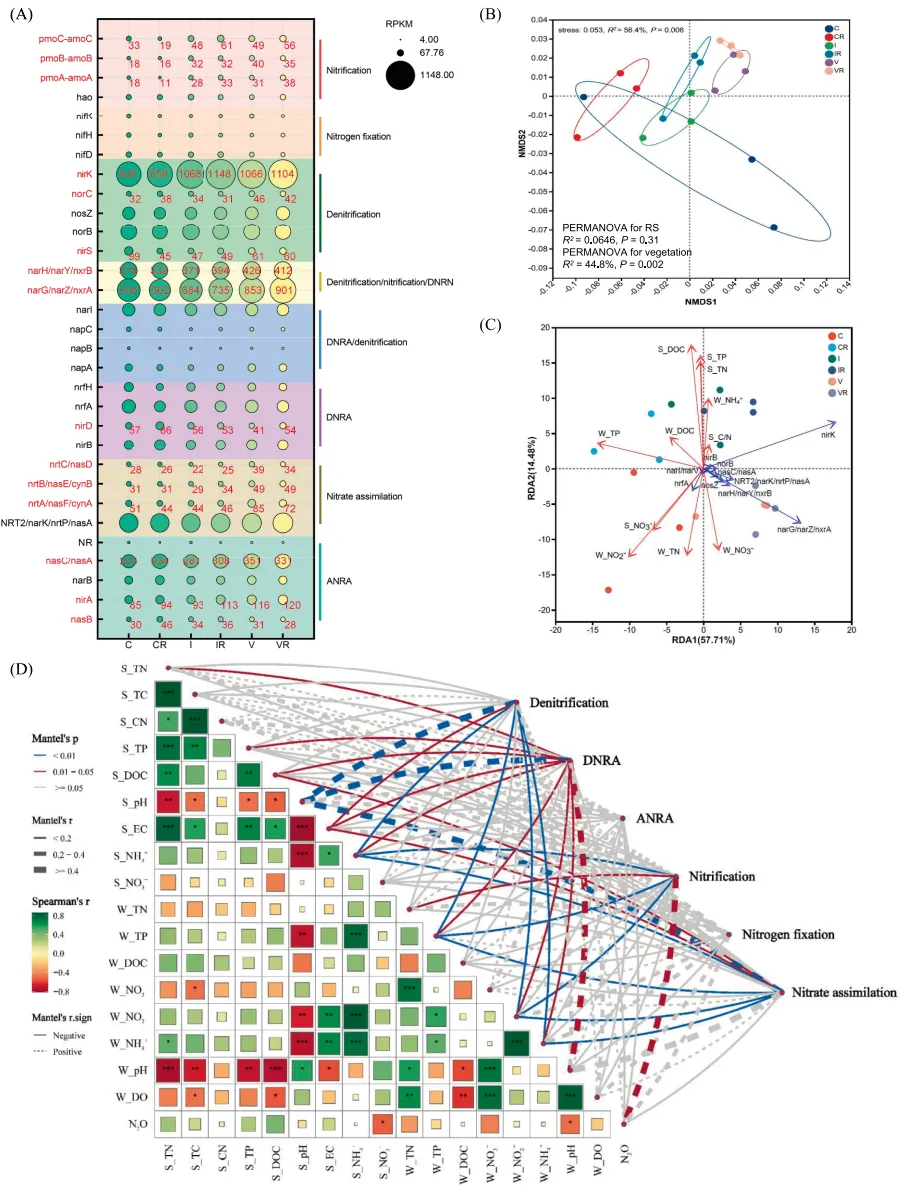图4:N循环功能基因变化,通过NMDS、RDA和Mantel检验揭示基因与环境因子关联。关键基因如nirK和nosZ的丰度受植被和稻草调节。