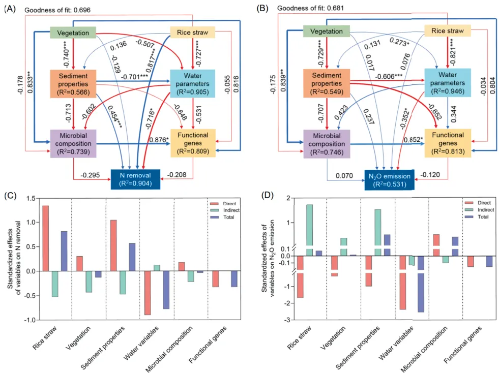 图5:PLS-PM模型展示植被、稻草、环境参数与N去除和N2O排放的多变量关系,突出非生物因素的核心作用。