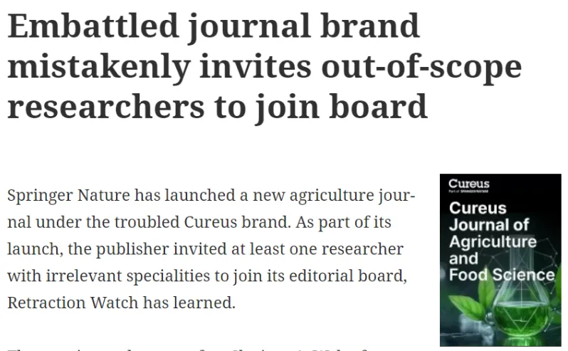 Retraction Watch: Cureus journal brand mistakenly invites sensory biologist to agriculture board (March 13, 2026). https://retractionwatch.com/2026/03/13/cureus-journal-brand-agriculture-food-science-mistakenly-invites-researchers-board/