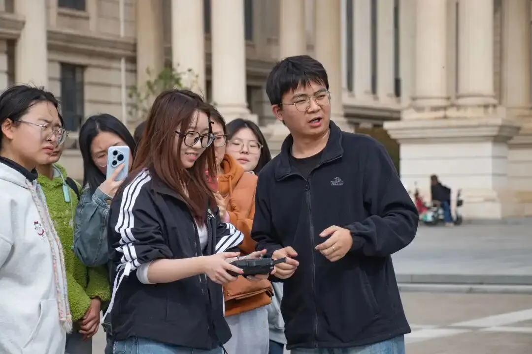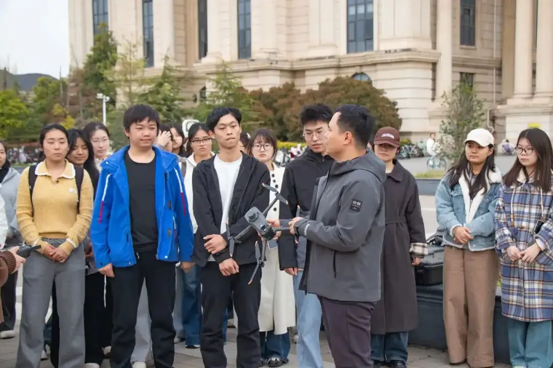 ▲余逢源带领学生在中心广场开展无人机试飞实操
