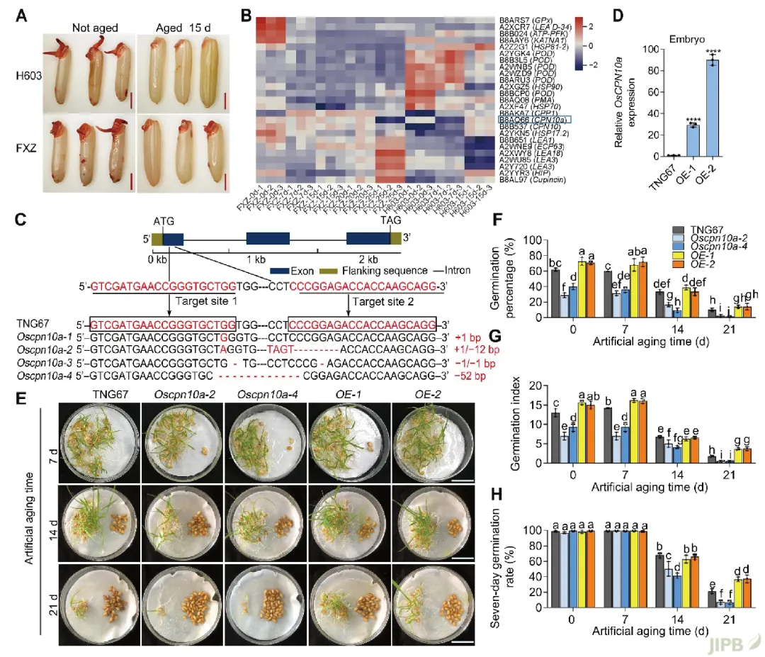 该研究利用蛋白组学技术首次鉴定到一个10 kDa的共伴侣蛋白OsCPN10a, 其表达受ABA信号转录调控, 是水稻种子耐储性的正向调控因子。为明确其功能, 研究团队利用CRISPR/Cas9基因编辑技术构建了OsCPN10a敲除水稻株系, 同时获得了OsCPN10a的过表达转基因株系, 并开展人工加速老化 (AA) 处理实验。结果表明, 老化处理14和21天后, OsCPN10a过表达株系种子芽率显著高于野生型 (台农67), 而敲除株系种子发芽率则显著降低 (图1), 表明OsCPN10a正调控种子耐储性。