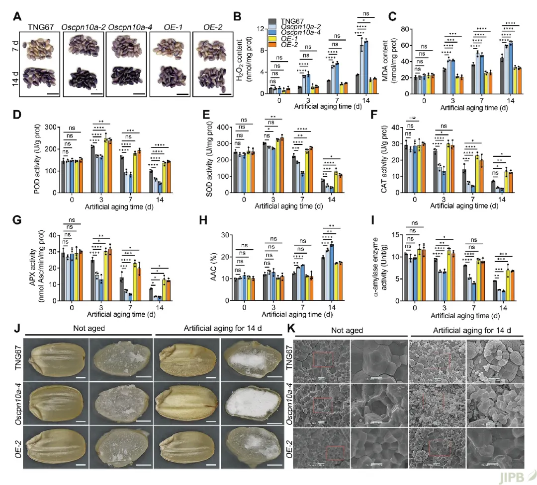 进一步研究发现, OsCPN10a缺失会导致种子在老化过程中抗氧化酶活性下降、淀粉结构完整性受损, 同时伴随活性氧 (ROS) 过度积累, 从而显著降低种子活力 (图2)。