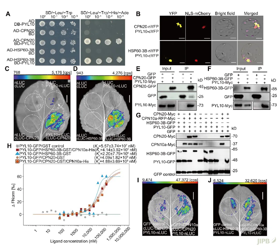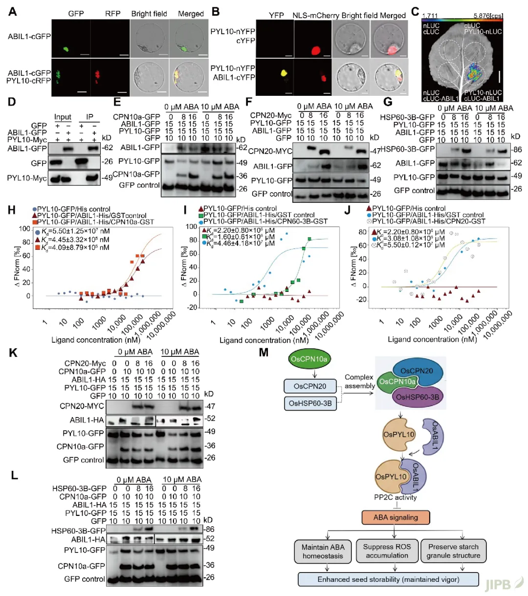 进一步机制研究表明, OsCPN10a并非独立发挥作用, 而是与OsCPN20和OsHSP60-3B形成功能性伴侣蛋白复合体。值得注意的是, 该复合体除了执行经典的蛋白质折叠功能外, 还参与调控ABA信号通路: 通过稳定ABA受体OsPYL10磷酸酶OsABIL1之间的互作, 精细调控ABA信号敏感性, 从而实现对种子活力的精准控制 (图3–4)。