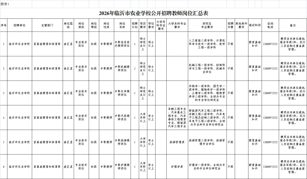 临沂市农业学校公开招聘人员的岗位条件、招聘人数等具体要求见《2026年临沂市农业学校公开招聘教师岗位汇总表》(附件1)。