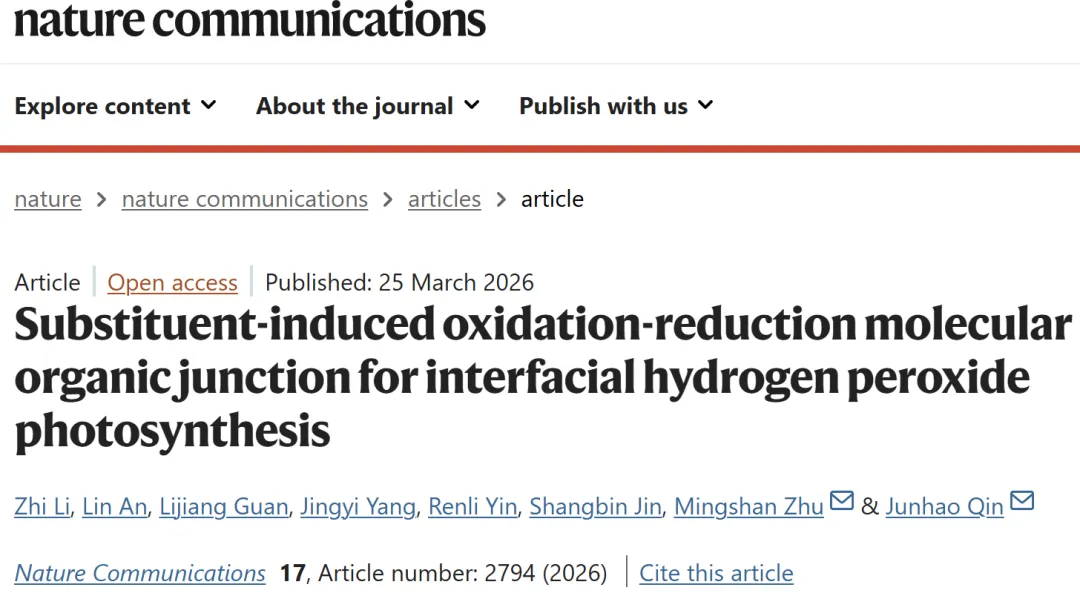 通过调控氟代苯连接体的配位数量,实现了三嗪环氧化与还原位点在空间上的分离。在模拟日光与超声外力作用下,该催化剂于气-液-固三相界面实现了高达4664 µmol g⁻¹ h⁻¹的过氧化氢光合合成速率。机理表明,光生空穴与电子可分别定向迁移至氧化位点(连接两个苯环和一个氟代苯的三嗪)和还原位点(连接一个苯环和两个氟代苯的三嗪),协同驱动水氧化与氧还原的双路径反应。