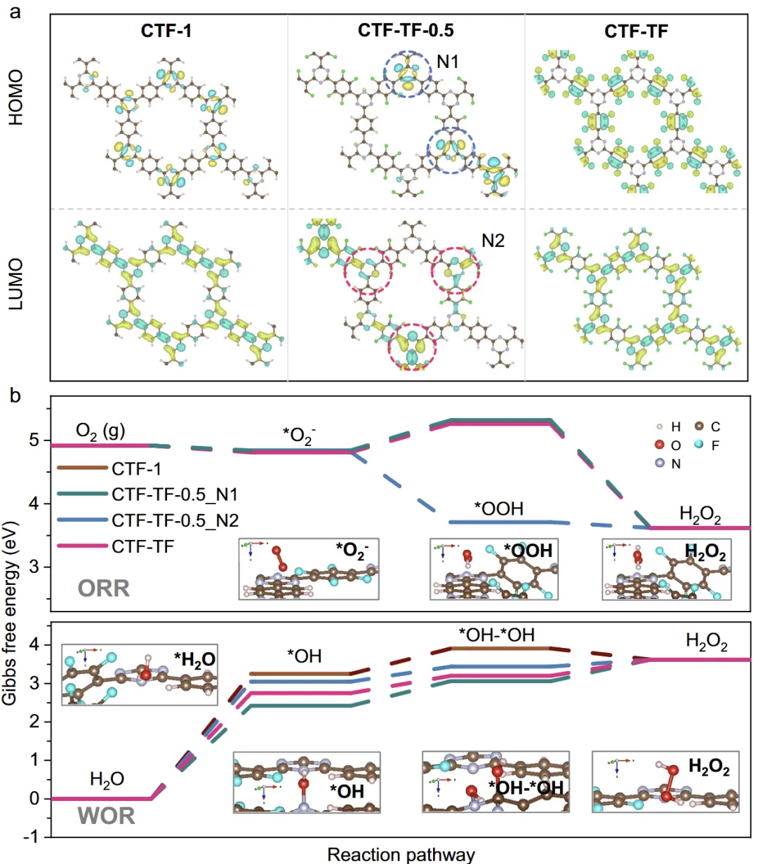 a HOMO和LUMO分布。b CTFs在ORR和WOR反应中的ΔG图。插图中显示了ORR和WOR中的过渡态。