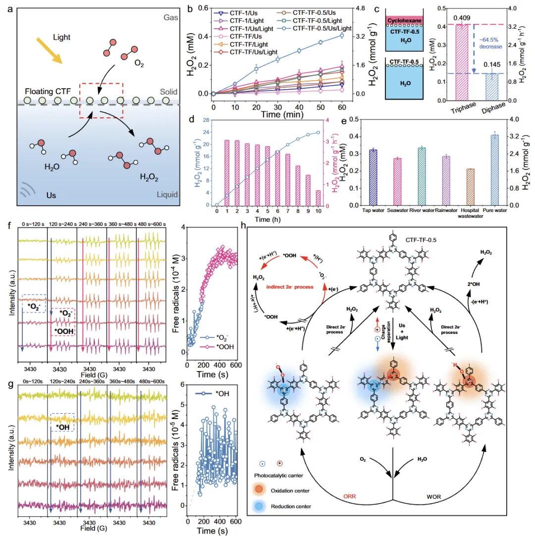 a 使用超声的三相H₂O₂光合作用示意图。b CTFs在不同场景下H₂O₂光合作用的时间曲线。实验条件:催化剂(0.125g L⁻¹)在超声和光照下,T=25°C的水中。c 在三相和两相反应系统中,使用CTF-TF-0.5在60分钟时的H₂O₂合成比较。d CTF-TF-0.5在10小时内的稳定性。e 使用CTF-TF-0.5在真实水样中的H₂O₂合成。f,g 在CTF-TF-0.5/超声/光过程中,ORR(f)和WOR(g)过程中不同自由基的原位EPR谱图及其浓度和寿命。h 提出的反应机理。误差线表示三次测量的标准偏差。