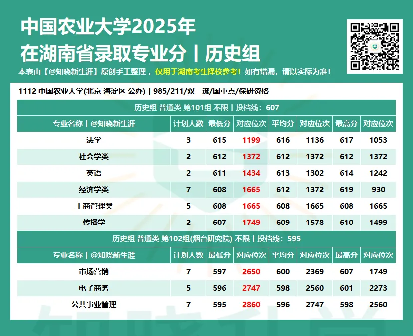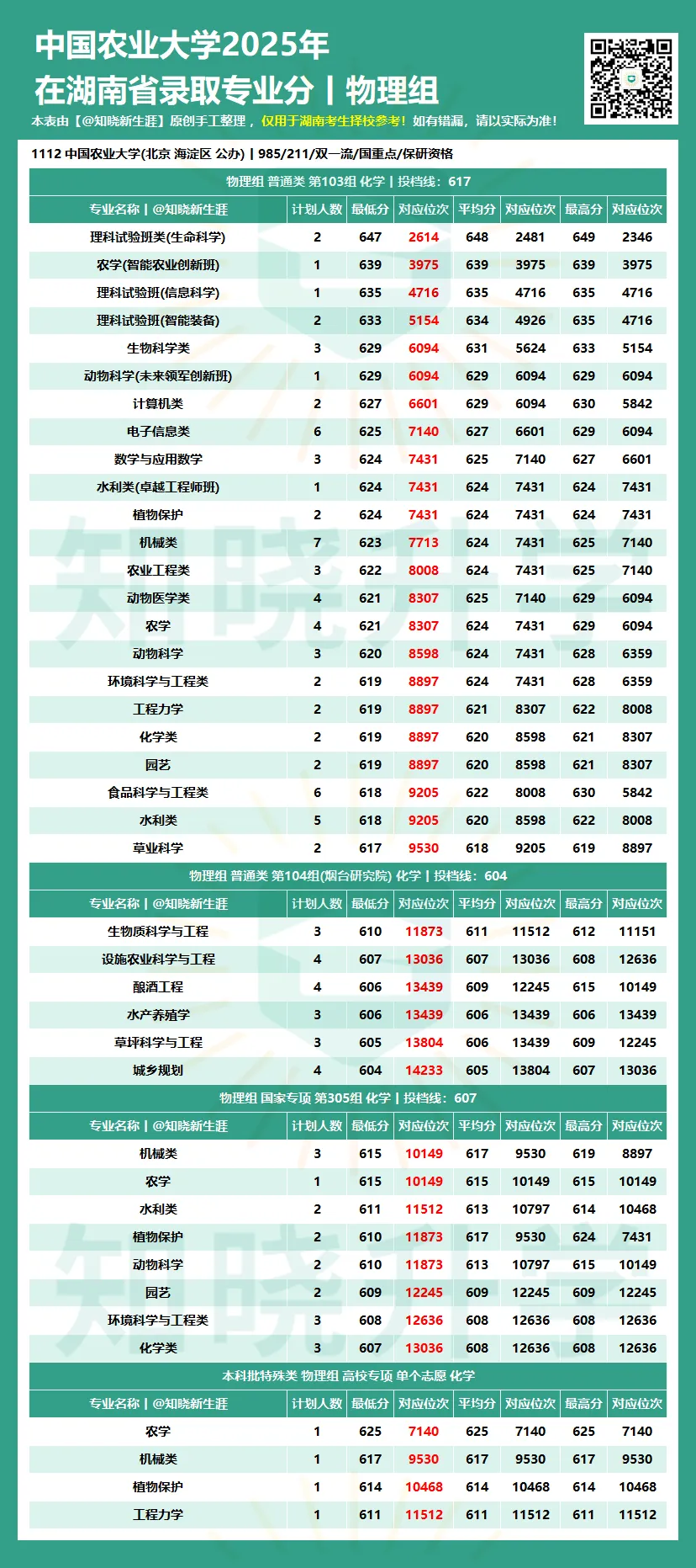 专业分丨中国农业大学2025年在湖南省专业录取分数线(含位次)