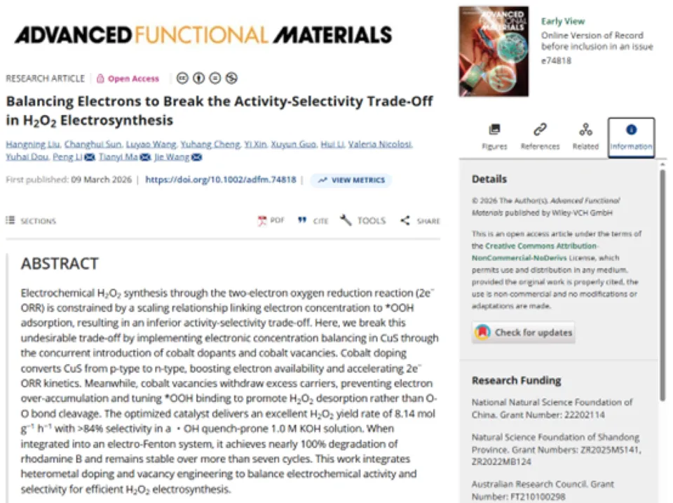 近日,青岛农业大学化学与药学院青岛市农业循环经济材料工程研究中心王杰教授团队在小分子污染物降解领域取得重要进展,相关研究成果发表于国际知名期刊《Advanced Functional Materials》(中国科学院一区TOP期刊,自然指数期刊,IF=19.0)。该研究提出并验证了电子平衡策略,有效突破了过氧化氢电合成过程中的活性-选择性权衡难题。这一成果为构建农业循环经济模式提供了新的科学支撑。