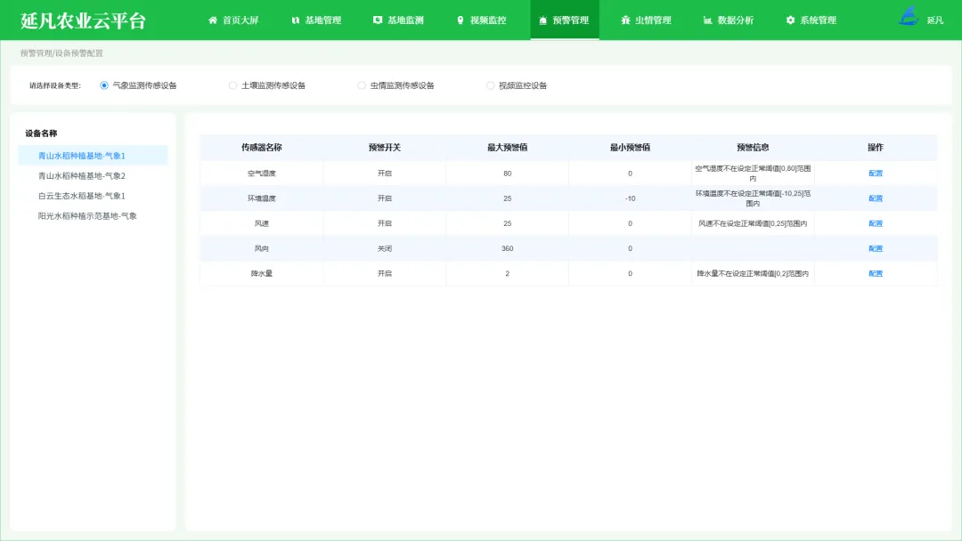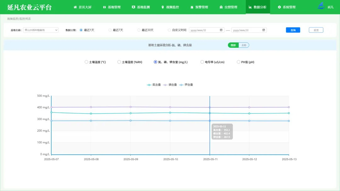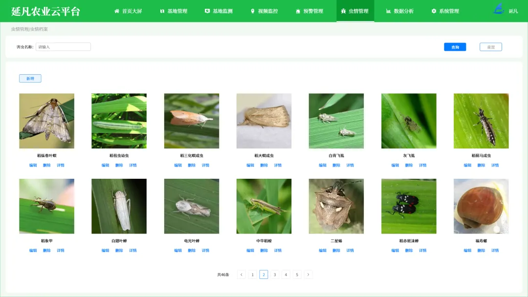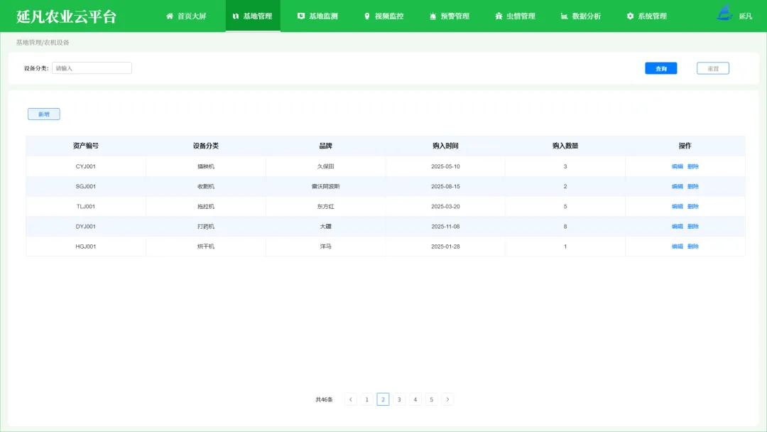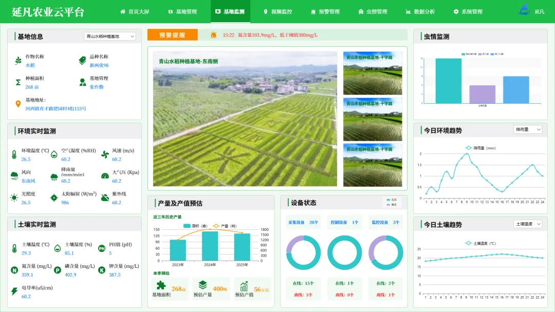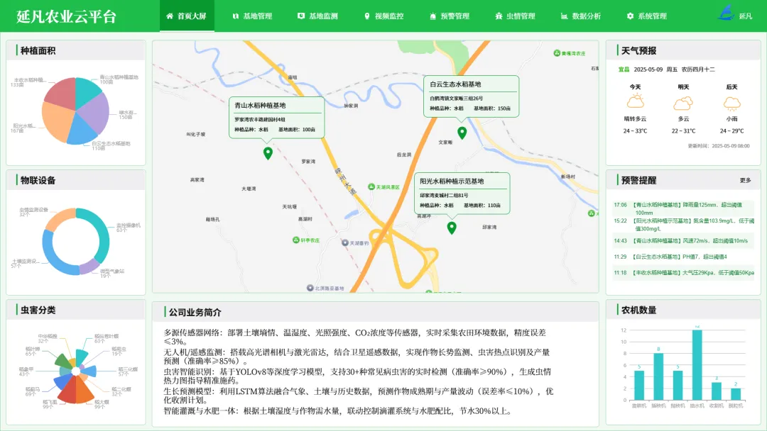 - 全域数据大屏:一屏统管基地分布、设备状态、气象土壤、作物长势、农事进度、虫情预警等核心数据,管理更直观、决策更科学。