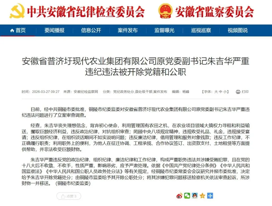日前,经中共铜陵市委批准,铜陵市纪委监委对安徽省普济圩现代农业集团有限公司原党委副书记朱吉华严重违纪违法问题进行了立案审查调查。
