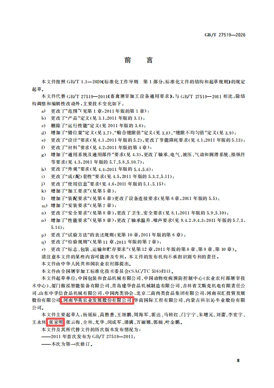 3月25日,国家标准《畜禽屠宰加工设备 通用要求》(GB/T 27519-2026)正式公告发布,将于 2026 年9 月1日起实施。河南华英农业发展股份有限公司受邀成为标准起草单位,公司副总经理张家明作为起草人,全程参与标准研讨、编制与审定,将华英在禽类屠宰、设备应用、卫生管控、安全生产等领域的成熟实践成果融入国家通用技术规范,为行业标准化建设注入华英智慧。
