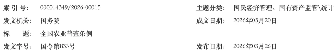 《全国农业普查条例》已经2026年3月13日国务院第81次常务会议修订通过,现予公布,自2026年5月1日起施行。