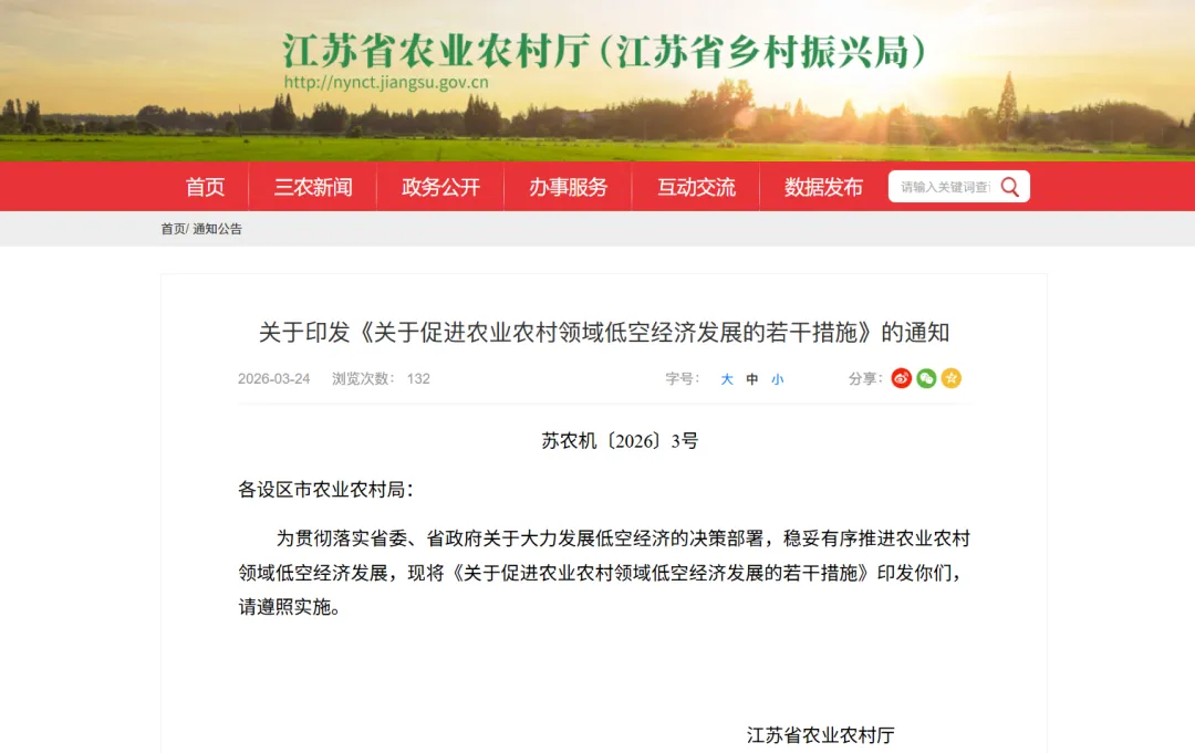 近日,江苏省农业农村厅印发《关于促进农业农村领域低空经济发展的若干措施》,旨在贯彻落实江苏省委、省政府关于大力发展低空经济的决策部署,稳妥有序推进农业农村领域低空经济发展。计划到2030年全省农用无人机稳定在4万台以上,作业覆盖率达到50%以上,有效推动科技农业、绿色农业、质量农业、品牌农业发展,有力释放农业新质生产力动能。