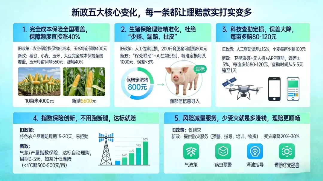 2026年农业保险新政,是真正给咱们农户兜底的好政策,五大变化全是实打实的福利:保障更全、赔款更多、理赔更快。