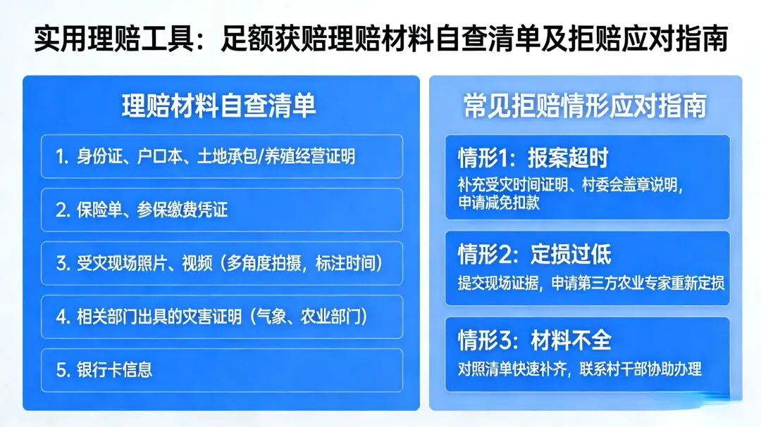 常见拒赔情形应对指南情形1:报案超时→补充受灾时间证明、村委会盖章说明,申请减免扣款;