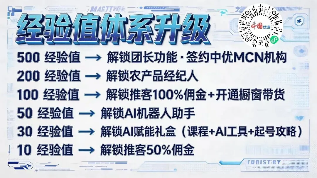 就是在中国优选你拿到农产品经纪人,就解锁了从10到200的权益,福利满满当当,如果原来你有10经验值(中国优选新人区赠送)的话,还能获得100%的佣金,相当于省了钱💰 今年咱们两会上就在讲,不要让假农民抢了真农民的权益,那未来你想播这种三农,直播都必须要持证。 左手握资源,右手通市场!2026年,不做旁观者,成为乡村振兴的“弄潮儿”!点亮致富路,从这张证书开始👇