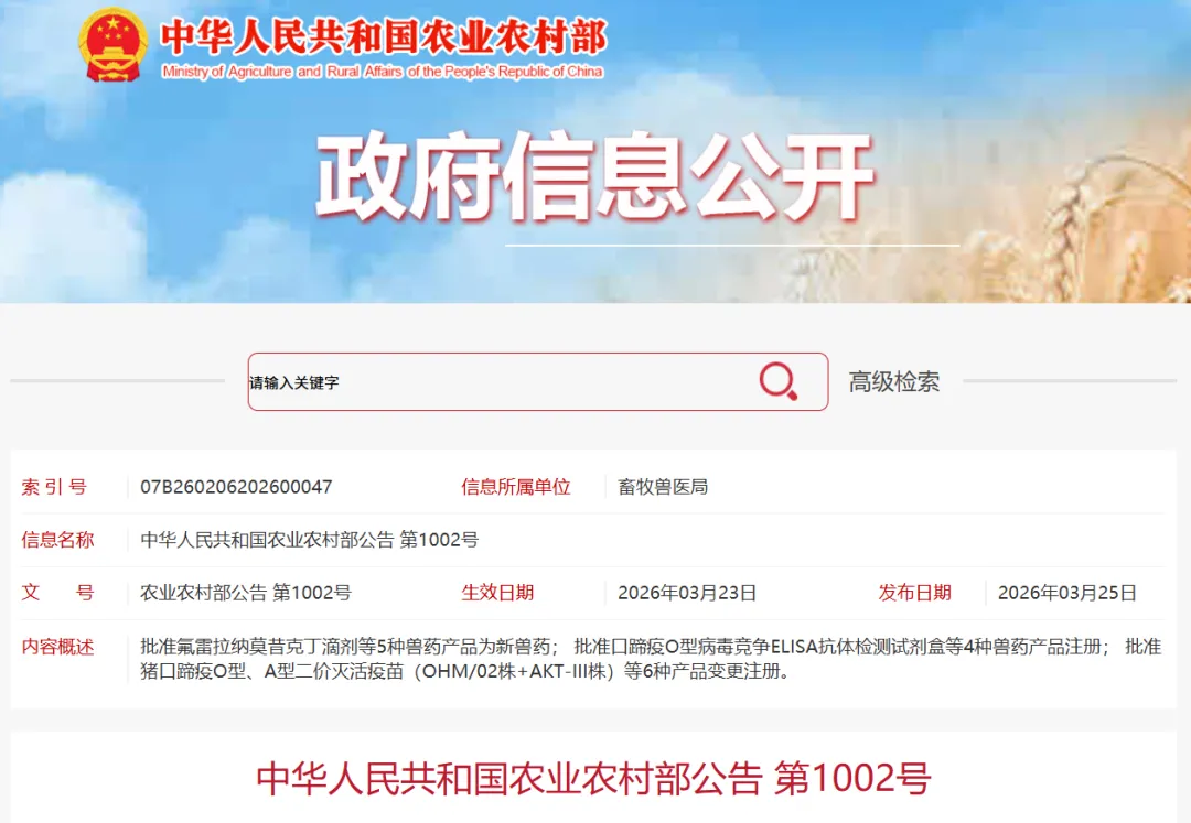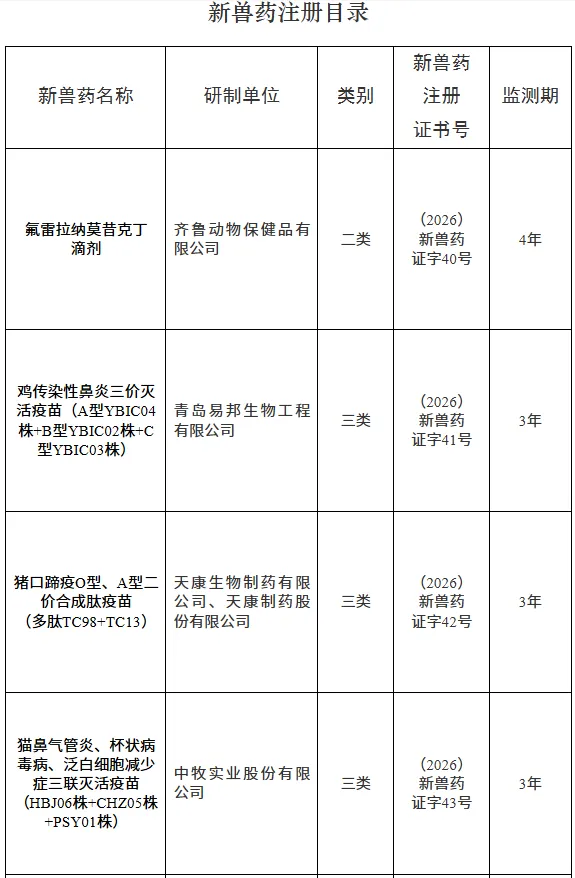 根据《兽药管理条例》和《兽药注册办法》规定,经审查,批准氟雷拉纳莫昔克丁滴剂等5种兽药产品为新兽药,核发《新兽药注册证书》,发布产品质量标准、工艺规程、说明书和标签,自发布之日起执行。